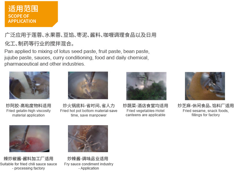 本產品鍋體為一次沖壓成型的半球不銹鋼鍋體,采用電加熱、蒸汽加熱、燃氣加熱,攪拌方式采用特殊的傾斜傳動,使用的行星攪拌器與鍋體充分接觸,實現傳動公轉與自轉的不整數傳動比,使鍋內無攪拌死角。使用先進的傳動與密封結構,使傳動部分與鍋內潔凈、衛生。采用變頻調速動力,運行更平穩。電磁加熱形式打破了明火烹調方式,具有升溫快、無明火、無煙塵、無有害氣體,對周圍環境不產生熱輻射,安全性好和外觀美觀等特點,是性能優良的食品加工設備。